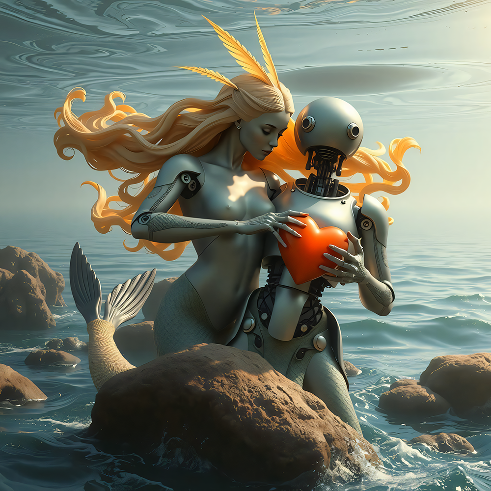 The Mermaid Match, 'DAVOS'.  A visual symbolic fiction picture; it offers a novel and vital approach by combining technology and empathy in environmental conservation. The key lies in using this metaphorical mermaid to inspire greater awareness and accountability, marrying innovation with compassion (heart) in the quest for a sustainable future. Here, the mermaid becomes a metaphor for overcoming the challenges of modern existence, Individuals must navigate the waters of technology, artificial intelligence, and an increasingly complex world. The transformative qualities of the mermaid suggest that by embracing this hybrid existence, individuals can adapt, evolve and ultimately thrive.  With a growing awareness of our responsibility toward the planet, the Mermaid Match serves as a testament to humanity’s ability to innovate, adapt, and heal.  I created the piece out of myself as if I were a mermaid and did some various research on this topic afterwards. Although my english is very good I am far better in reading than writing it myself. Therefore, I find that ChatAI is the perfect tool for me. https://platform.wise.art/author/dlelalombard/ https://www.instagram.com/d_lela.art/